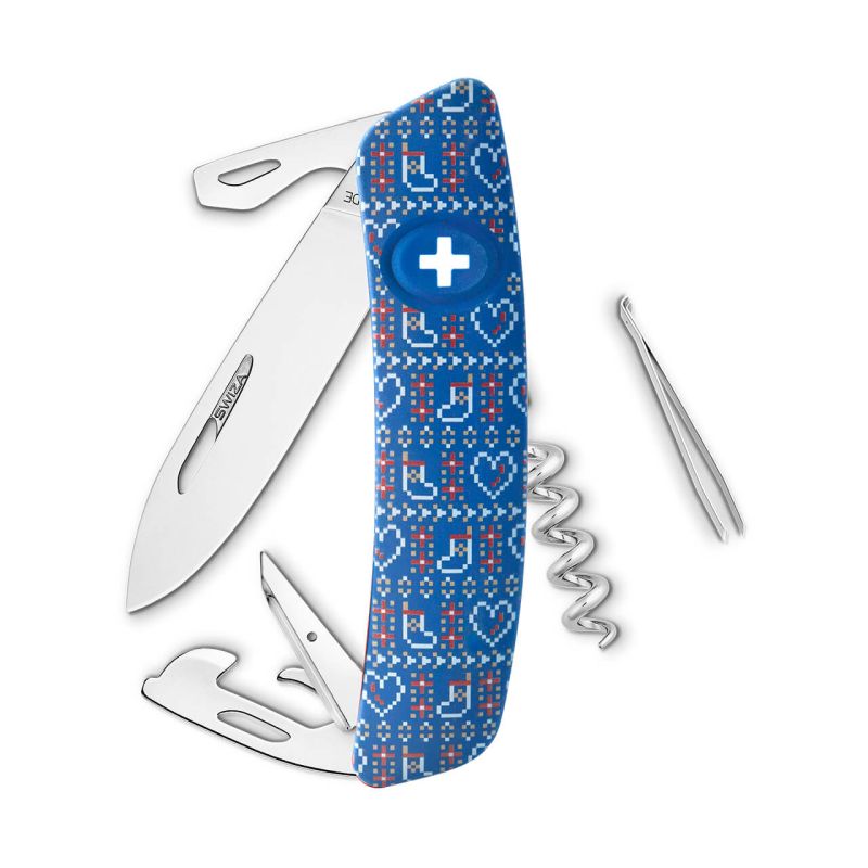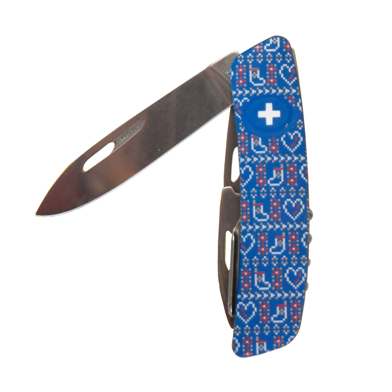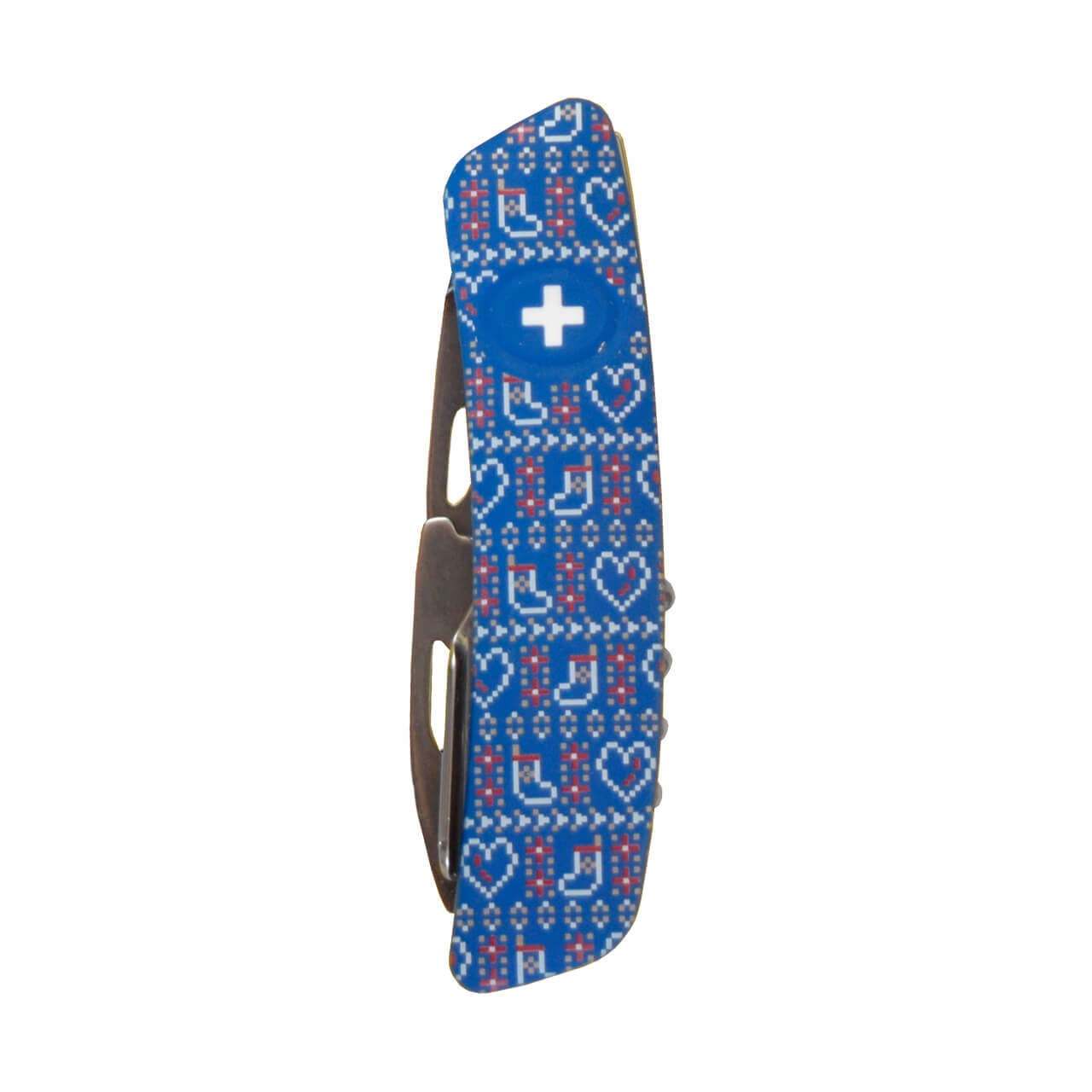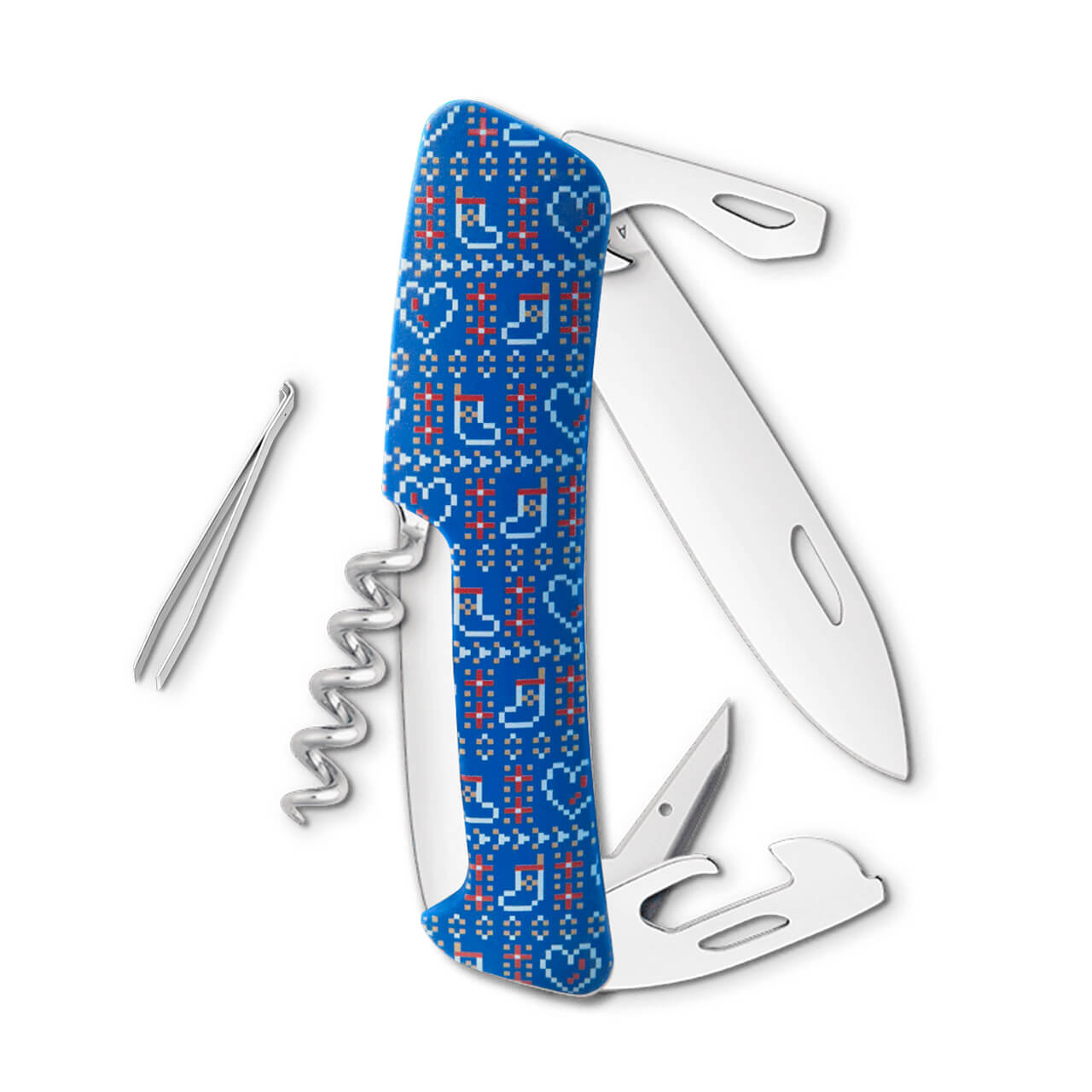 Navaja suiza con diseño ergonómico que te proporciona un agarre natural y fácil acceso a sus herramientas. Cada una de ellas cuenta con un orificio para el pulgar, facilitando su manipulación tanto para zurdos como para diestros. La hoja está hecha con acero inoxidable de primera calidad (440/57 HRc) y la cacha está fabricada con bio-plástico. Esta edición especial cuenta con un diseño de corazones a modo de borado en colores rojo, blanco y café sobre un fondo azul.