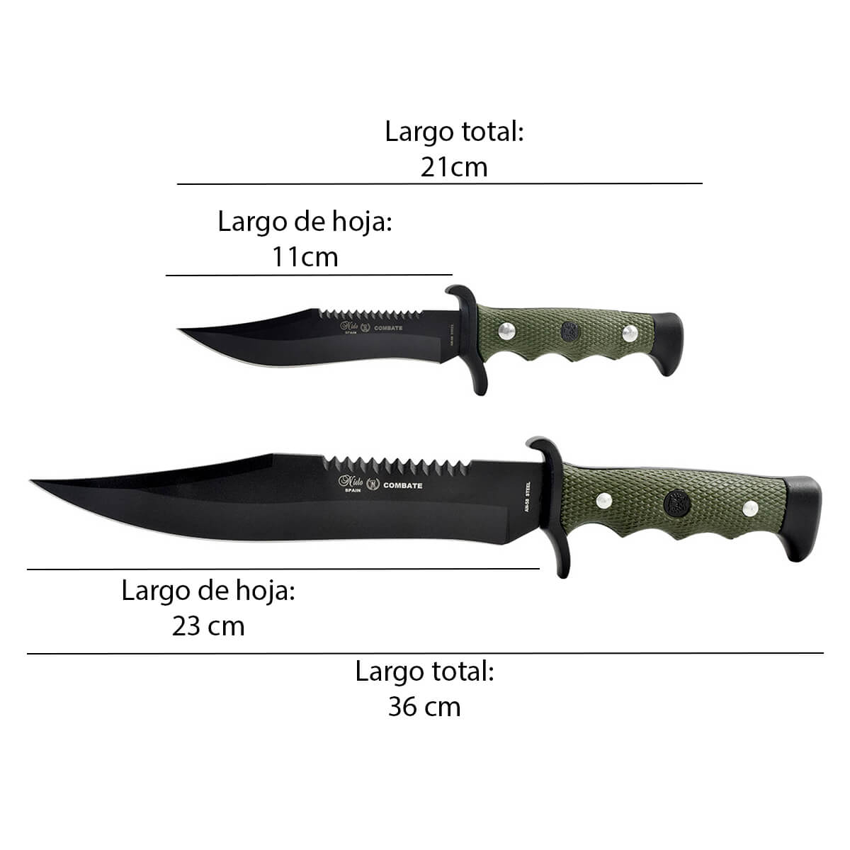 Duo de dos cuchillos de la línea "Combate", de acero inoxidable AN-58 pavoneado (lo que lo protege de la corrosión y mejora su aspecto), mango de ABS y zamak, material resultado de la aleación de zinc con aluminio, magnesio y cobre y pintura epoxi verde. Su hoja es lisa en la parte inferior y en la parte superior cuenta con una sierra. Cuenta con una funda de cuero con doble entrada para proteger el filo de los cuchillos. La fabricación ha sido mixta, lo que quiere decir que sus hojas han sido elaboradas con todos los avances técnicos y los mangos están totalmente trabajados a mano. Todas las piezas son montadas con precisión y eficacia, aportando el artesano su distintivo personal a cada pieza. Elaborados en Albacete, España, conocida como la «Ciudad de la Cuchillería».