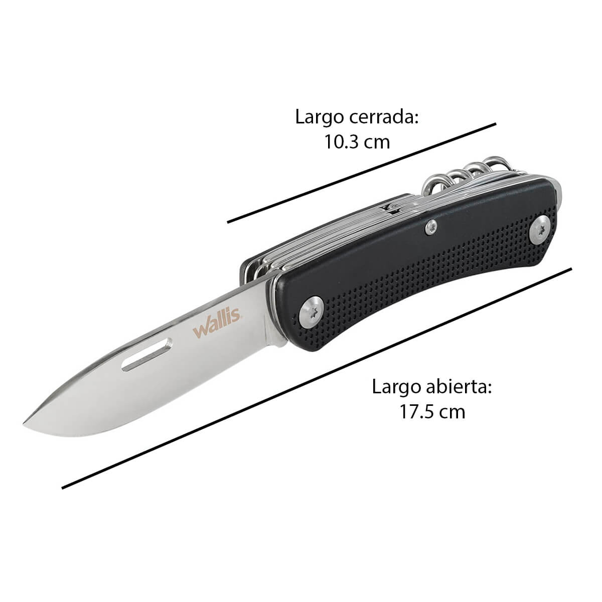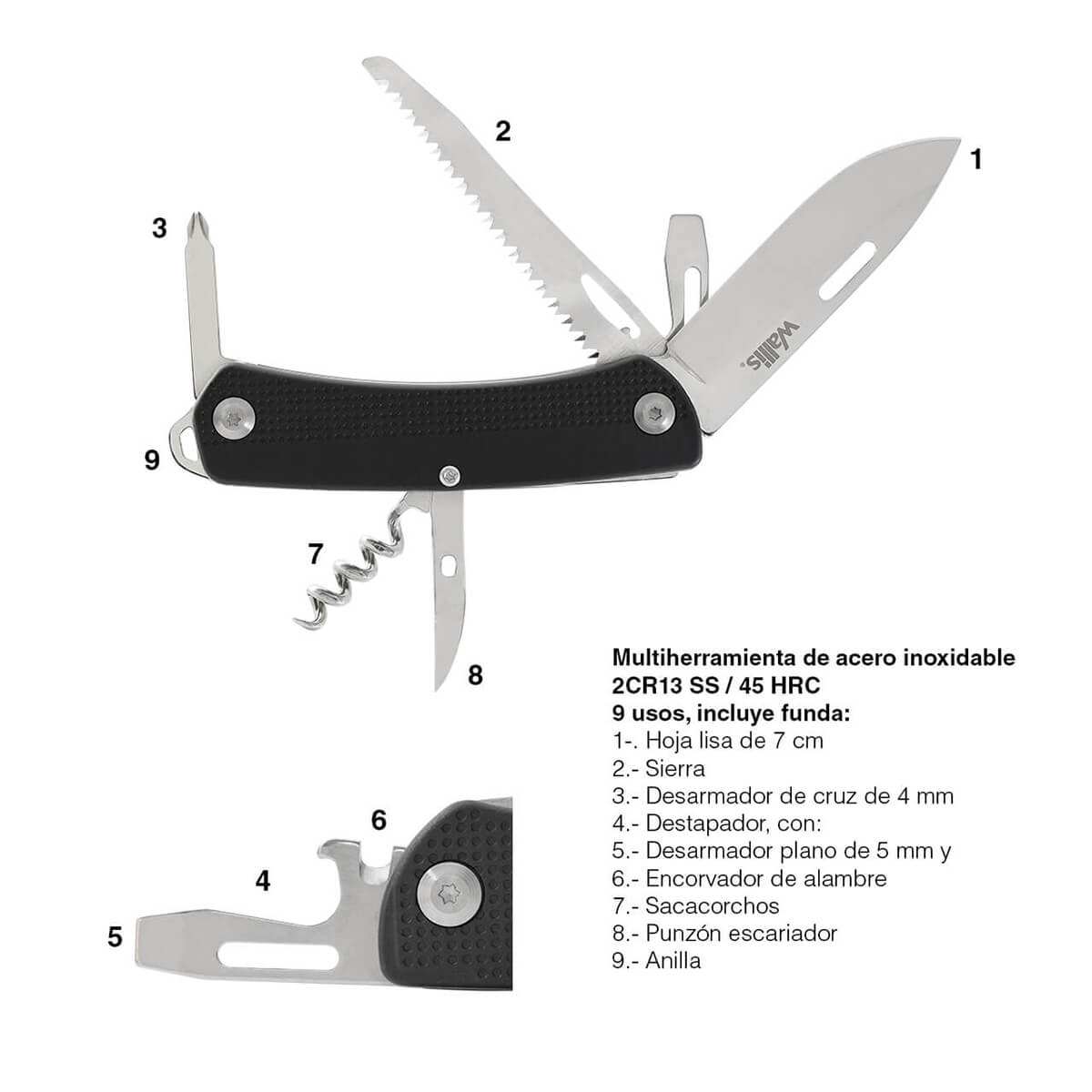 Descubre la combinación perfecta de funcionalidad y durabilidad con nuestra Multiherramienta Wallis. El sacacorchos integrado te permite disfrutar de un buen vino en cualquier lugar, mientras que el punzón escariador te brinda la precisión necesaria para tareas de perforación y escariado. Compacta, ligera y extremadamente versátil, nuestra Multiherramienta Wallis es la elección perfecta para quienes buscan calidad y rendimiento.